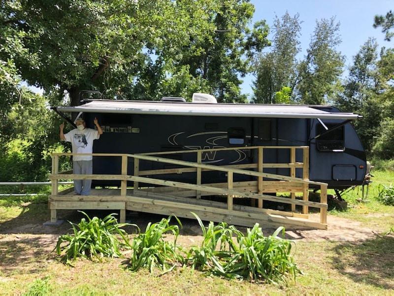“He is thrilled with his new home and so grateful for all the help he has been given. After the trailer was placed on the property, a team of volunteers designed and built a handicap ramp for him and his elderly dog.”