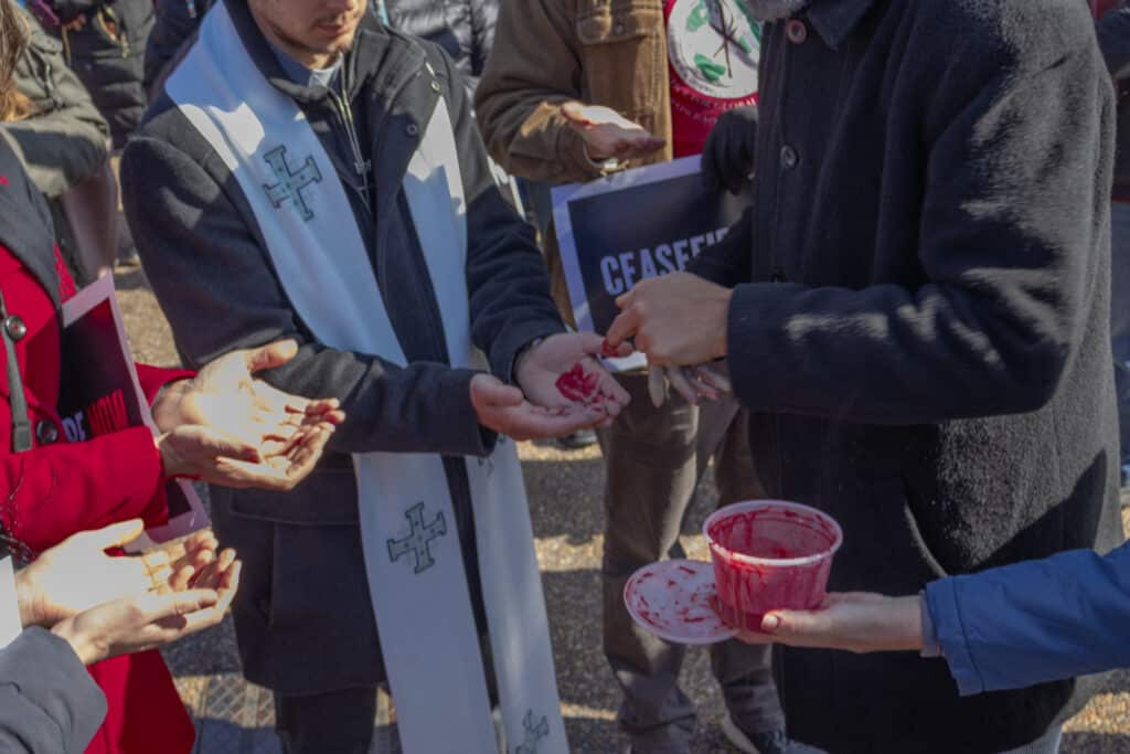 In his preceding reflection, Hagler stated, “Reflecting on the rituals of the church, sometimes we have detached the context of what we do from why we do it. These ashes represent children and lives buried in the rubble by America enabling the genocide to go on. We stand against that today. We remind on ourselves that as there’s ashes on our heads, there’s also blood on our hands.