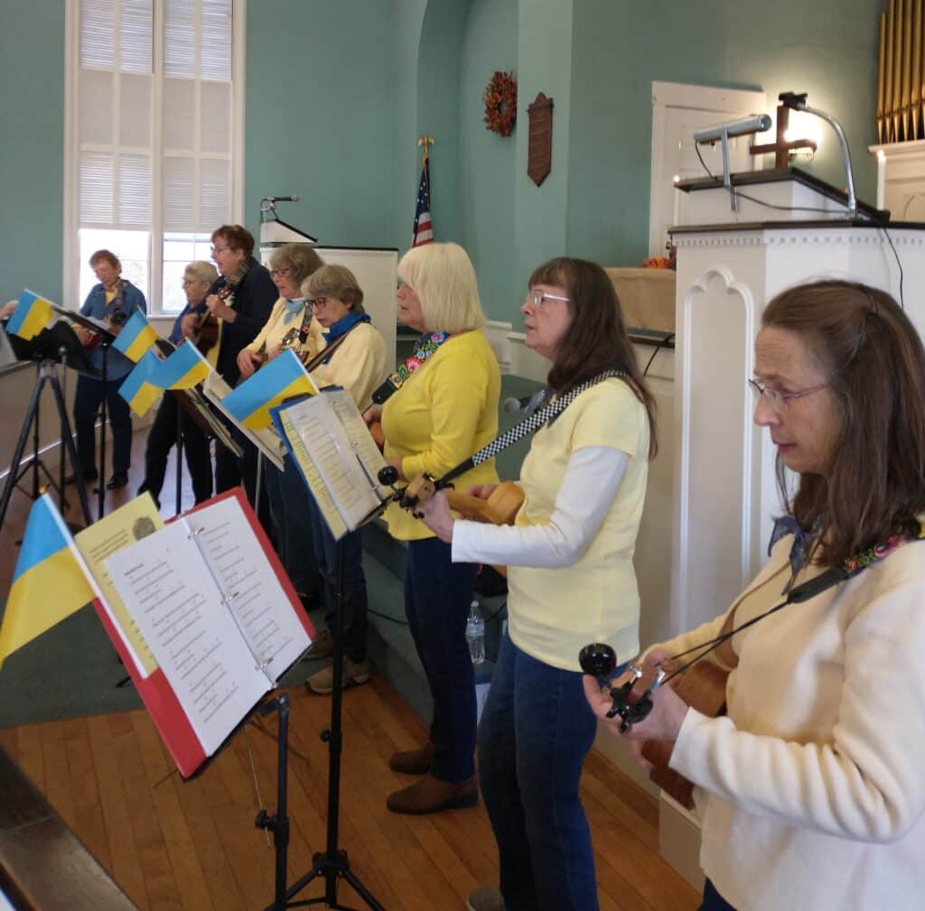 When Doe wrote to fundraisers about her benefit concert, she was surprised that Ray and others offered to attend, bringing posters and stories about the Ukrainian relief efforts. “It really beefed up what we were doing,” she said. The band of eight ukulele players performed several songs, a church member performed a song they had written about Ukraine, and the Bristol UCC music minister led attendees in singing “Let there be peace on earth.”