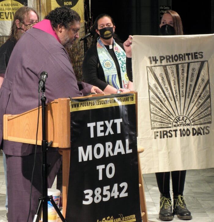 Since 2018, the campaign’s online and in-person rallies have featured testimonies about poverty and other interlocking social ills. In Cleveland, these came from rural areas as well as cities in Ohio and its surrounding states. People described being hurt by low pay, polluted water, strip mining, poor health care, gun violence, lack of insurance and more. The cathedral crowd responded to each story by chanting, “And we won’t be silent anymore.”
