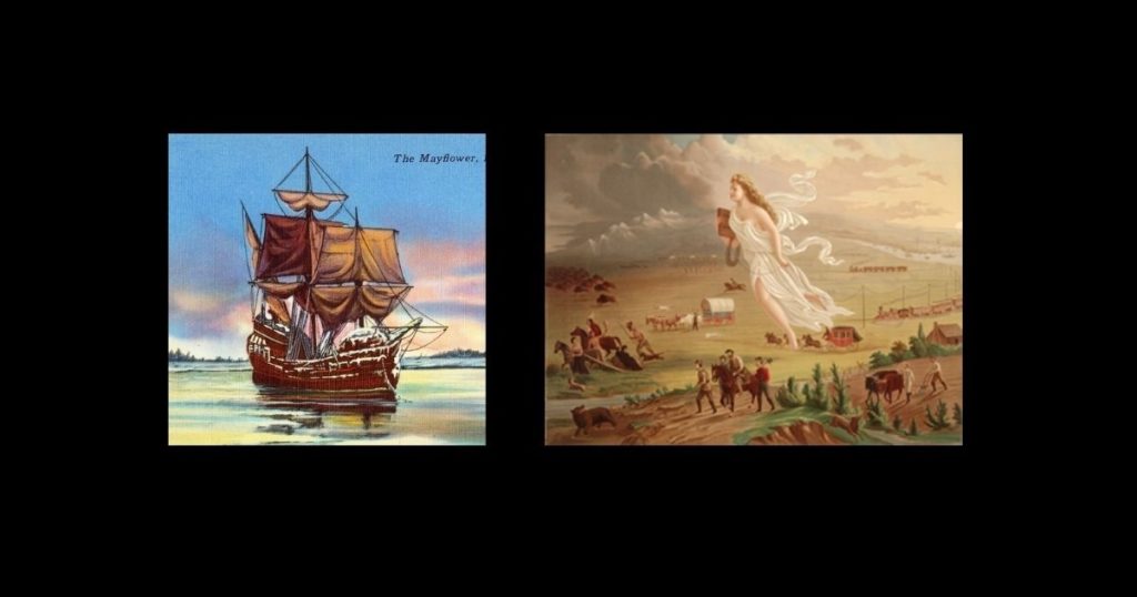 A recent one is a Nov. 16 blog post by the Rev. Kelly Gallagher, an associate conference minister of the UCC’s Southern New England Conference. In it – and in a web page of “First Encounter” resources for individual and church study – she called on Christians to acknowledge centuries of violence committed by and in the name of the church. (To read her article, click the image at right — John Gast’s 1872 painting, “American Progress,” illustrating the doctrine of “Manifest Destiny.”)