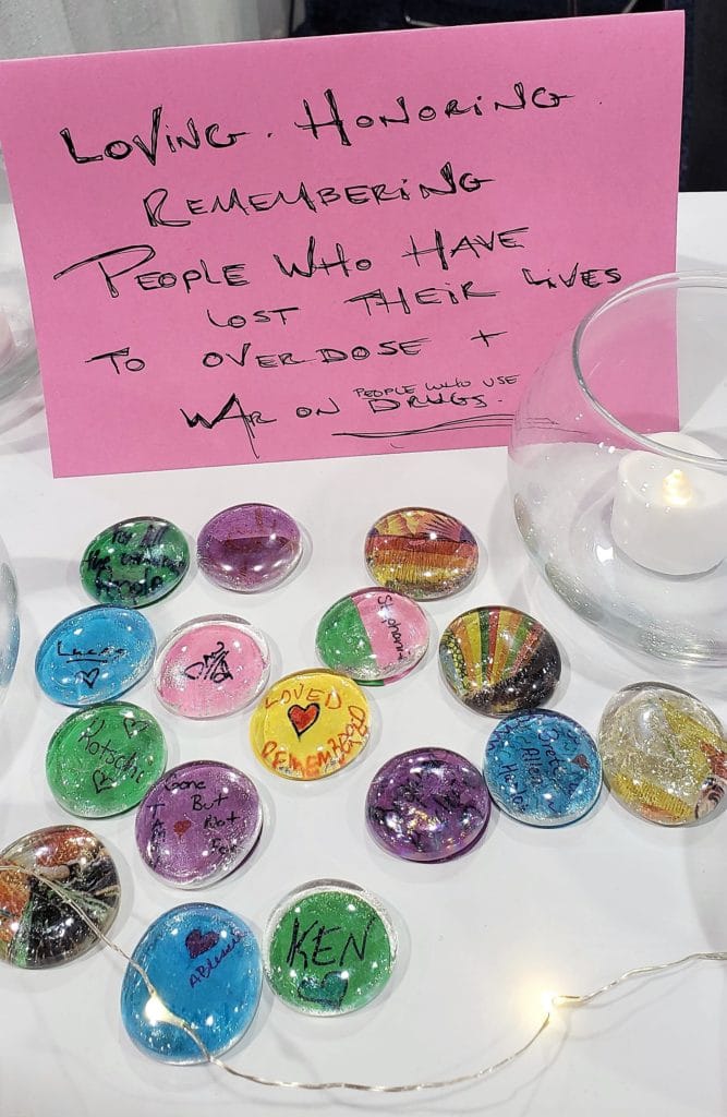 To help communicate the core message, there was a table with “beloved by God” buttons, rainbow bracelets and a book where mourners could share memories. There were tables with Naloxone, information about meetings and phone lines for support, mobile syringe programs and more. People from Southside Harm Reduction Services were there, training people to use overdose rescue kits, which they could take home. An offering received that day brought in more than $2,000 for the agency.