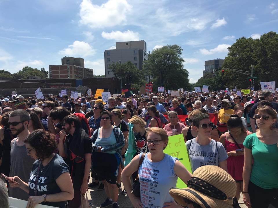 Said Dorhauer, “Their vile speech, a contrast both in content and impact on the public narrative, was silenced. Their collective impotence was on full display while justice advocates rang down through every corridor of this city. The young black women and Latina women who led the march through the streets were powerful, strong, courageous voices. They made me proud to be their follower through the streets. Residents watched us, chanted in support with this, held their children and let them witness this display of love, peace and courage. They were hanging out windows, standing on rooftops, front porches and front steps. They sang with us, they hugged us, they clapped for us, and they cried in front of us.”