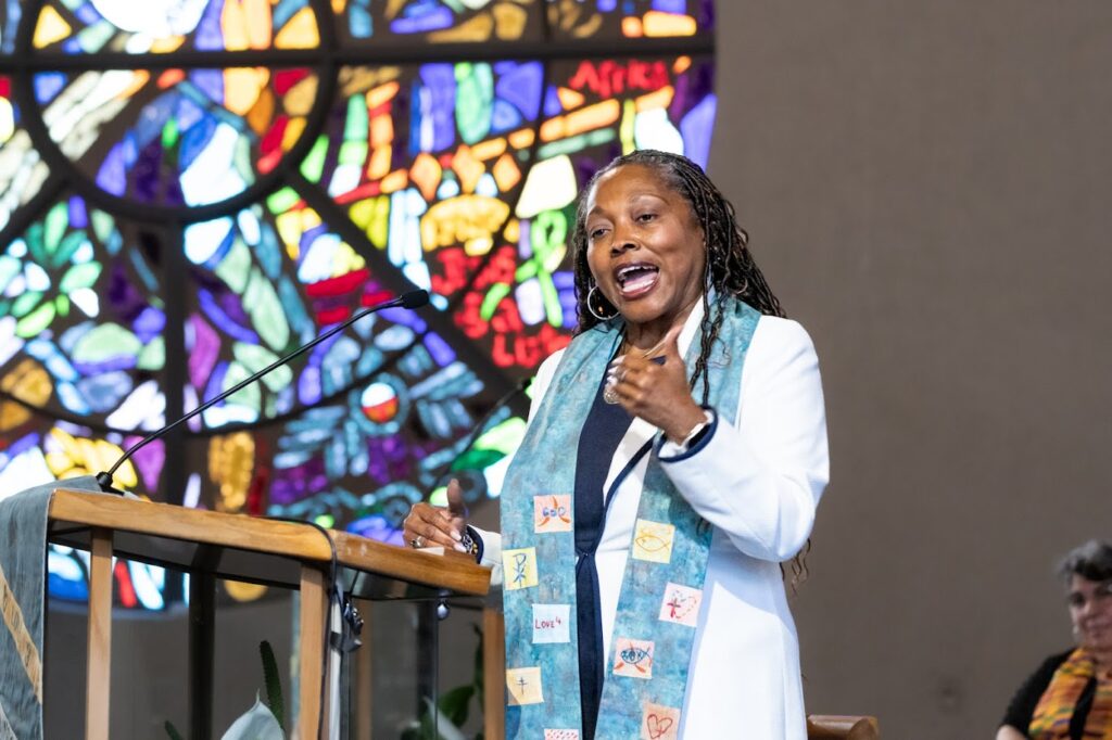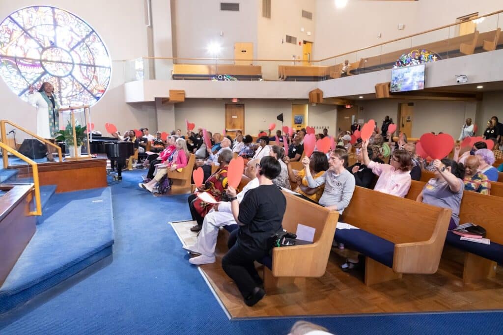 Many felt the highlight of the day was the worship service lead by guest preacher the Rev. Karen Georgia Thompson, UCC general minister and president. Her fiery sermon was entitled “And Yet,” which explored the meaning of love while respecting diversity. Communion was celebrated together, and the service concluded with waving red hearts while shouting out examples of love of service and ministry projects.