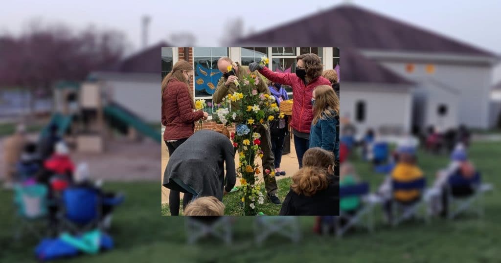 A family unit of worshipers adds blossoms to a “flowering cross” during an outdoor Easter sunrise service at Rock Spring Congregational UCC, Arlington, Va., on April 4.
