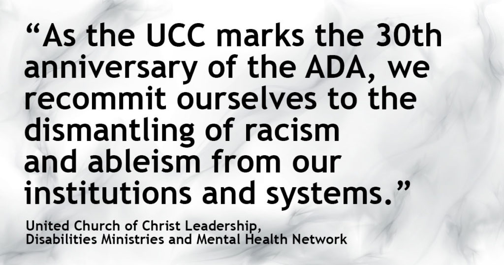 As the United Church of Christ marks the 30th anniversary of the ADA, we celebrate that we have come a long way and we confess that we have a long way to go. We recommit ourselves to the dismantling of racism and ableism from our institutions and systems. We commit ourselves anew to continuing to shift paradigms toward greater accessibility. Our goal is not only accommodation, but also integration of the modalities necessary to make certain everyone knows PWD are not only welcome in the United Church of Christ, but that PWD belong and are an important part of the Body of Christ.