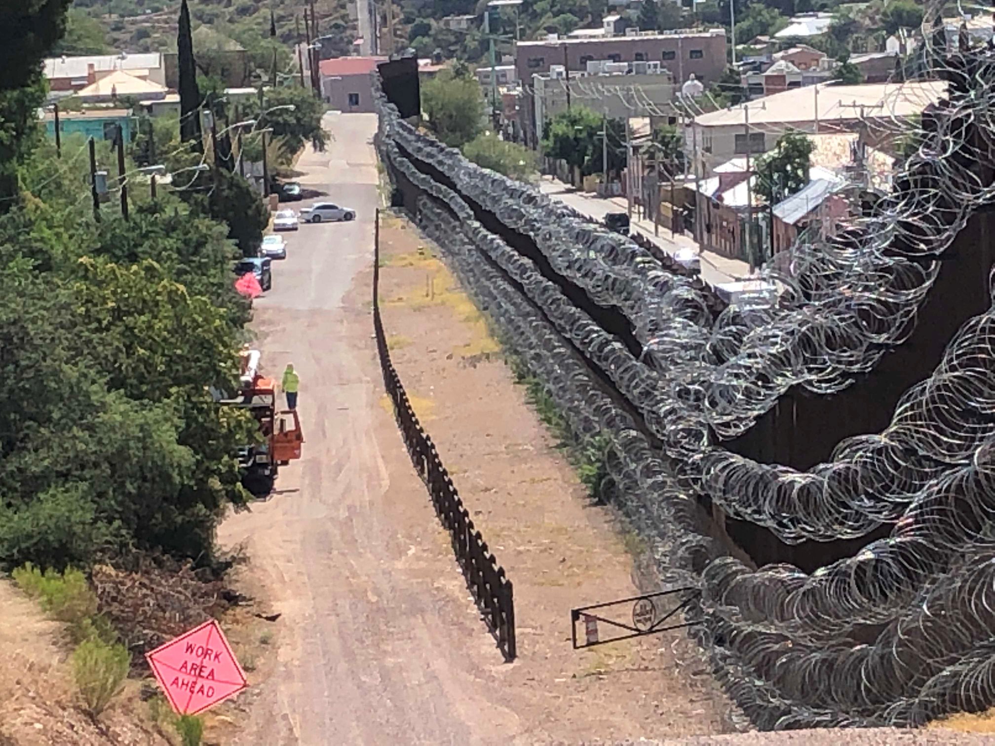 neighbors and passers-by from being sliced by the blades on the coils of wire welded over the mesh welded to the steel columns that is the border wall.
