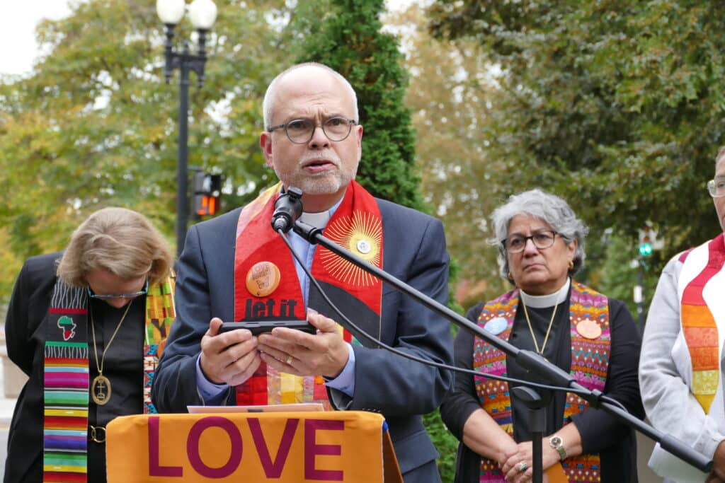 Rev. David Long-Higgins shares speaks at ‘Love Knows No Borders’ public witness on Wednesday, October 29.