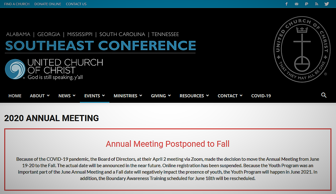 One example is the situation in the Southern New England Conference, which encompasses Connecticut, Massachusetts and Rhode Island. It has replaced its June 20 Annual Meeting with an “all-Conference gathering” to be held online Sept. 26. The question Conference leaders are facing is whether the latter will count legally as an annual meeting.