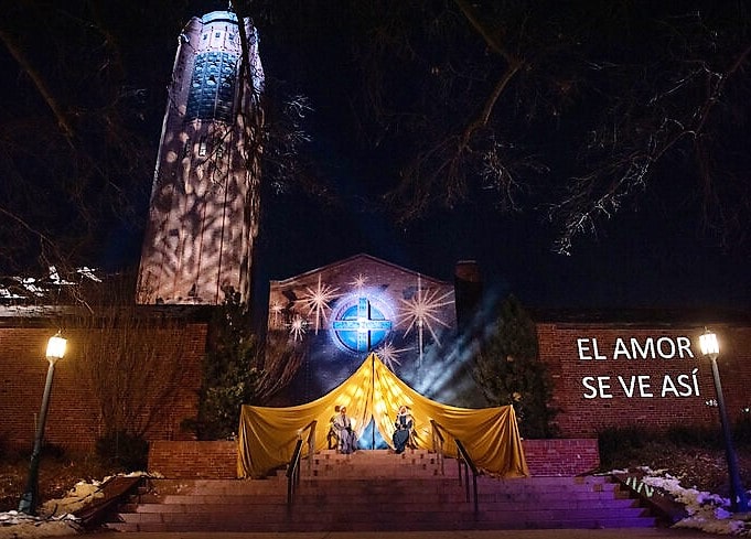 The church hired Omaha-based Theatrical Media Services to light its campus, including the tower. Theater designers from the University of Nebraska–Lincoln built animal puppets, life-size and larger. University actors are playing characters from the biblical Christmas story: Magi, wisdom figures, Mary and Joseph.
