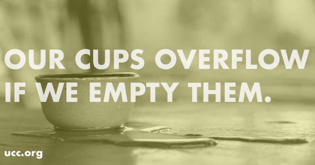 What is the difference between an empty cup and a full one? The difference is in the risk of emptying it. Overflow energy comes after we spill, not before. Instead we hear the waterfall in the background, the replenishing of plenitude released. Plenitude hoarded gets tinny. Spilled, it flows. Our cups overflow if we empty them.