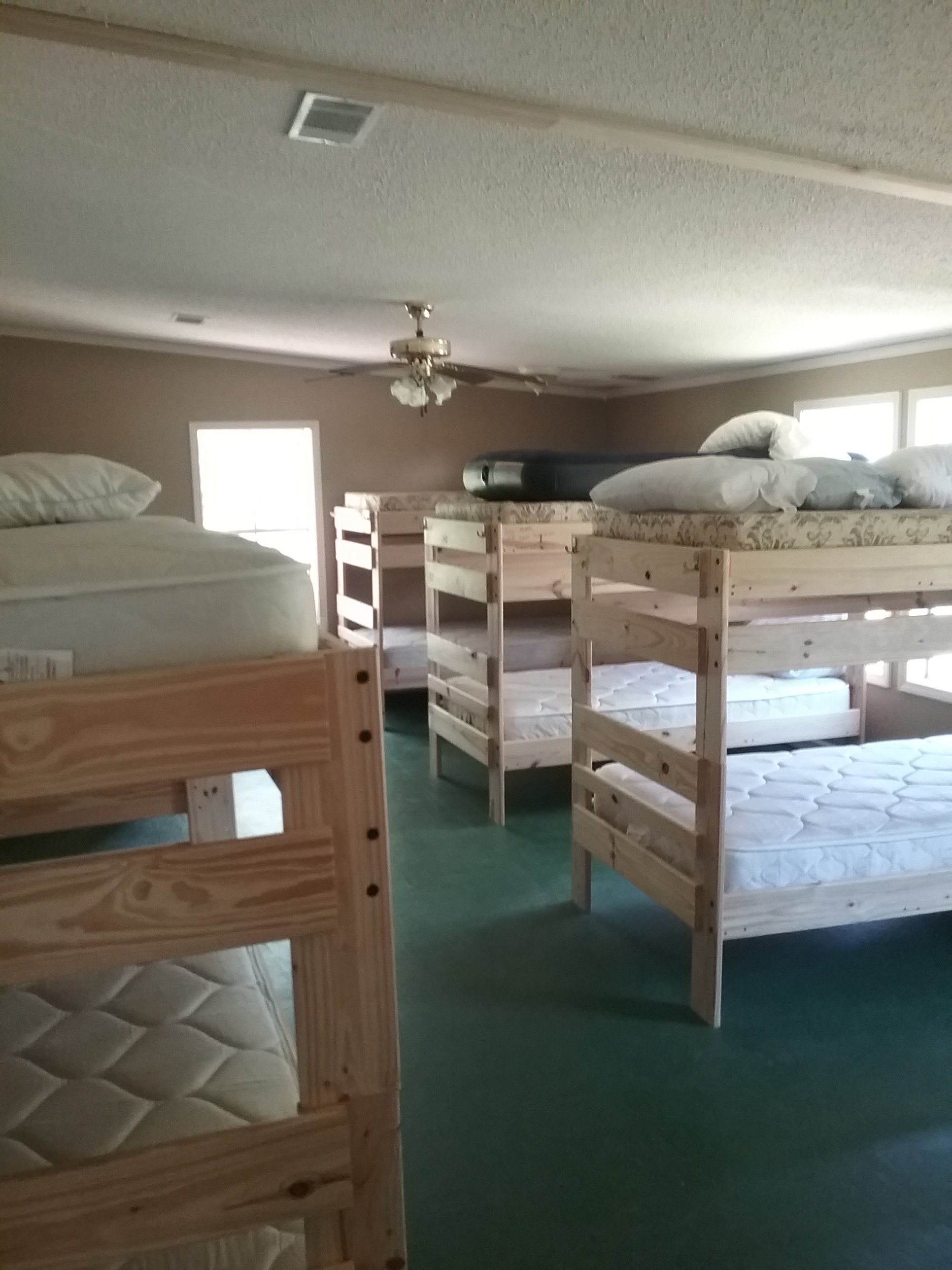 Accommodations: Our camp is located at 10607 Cassle Rd, Denham Springs, LA 70726 in the middle of a small horse farm. We have a spacious four-bedroom bunkhouse with beds to accommodate 26 volunteers. The dining hall and kitchen are close by in a converted barn with cedar and cypress walls and rescued heart pine floors.