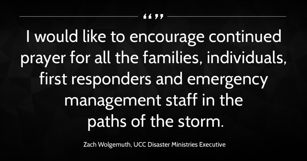 “If you have family and friends in any of these locations, I would strongly encourage that they heed the local and regional warnings being issued by emergency management officials,” Wolgemuth said, a suggestion echoed by Southern Conference UCC leaders.