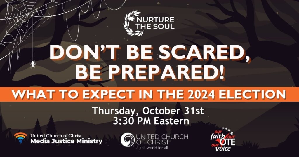 The calendar said Halloween, but on October 31, the United Church of Christ wanted to help keep the “scaries” away when it comes to Election Day jitters — and offered a Nurture the Soul webinar called “Don’t Be Scared, Be Prepared! What to Expect in the 2024 Election.”