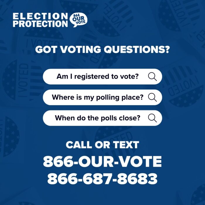 - Ensure that team also tells the congregation that if they learn last minute changes to polling locations or hours, to call the election protection hotline (866-OUR-VOTE/866-687-8683/888-VE-Y-VOTA/888-839-8682/888-API-VOTE/888-274-8683) and let the team know, so that they can also help inform local officials of any potential misinformation campaign