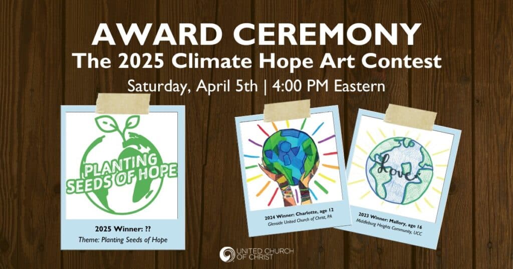 Join us as we celebrate the art of our 2025 finalists for the UCC’s Climate Hope Art Contest for children and youth. The theme this year was “Planting Seeds of Hope.” UCC children and youth are invited to draw, paint, or color works of art that bring this theme to life. In the ceremony, we will see the art of all our finalists. We will have winners for different age groups and an overall winner who will receive an all-expense paid trip to visit Washington, DC with a parent or guardian. The winner will advocate with the offices of their congress members, tour the Capitol, and learn how they can bring their faith values to life in the halls of power. The winning art will additionally serve as the logo for UCC Climate Hope advocacy work throughout 2025.