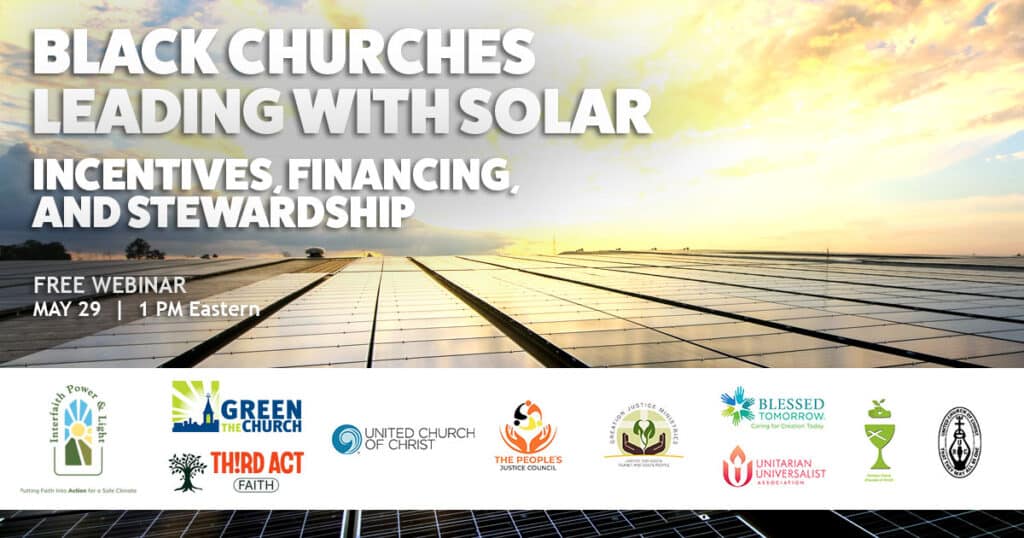 With the federal government paying for at least 30% of the cost of solar installation, if not 40 to 50%, many congregations that own their own building can no longer afford to not go solar. One of the benefits of going solar is a lower electricity bill, which means an increase in churches revenue. An increase in revenue is an increase in security and ministry. It is also a way to show good financial and environmental stewardship. Yet, the upfront cost of going solar can often be a hurdle for some congregations. This is where advantageous financing can play an important role. In this webinar, we focus on Black churches leading with solar. We will hear experts discuss everything one needs to know about government incentives and solar financing.