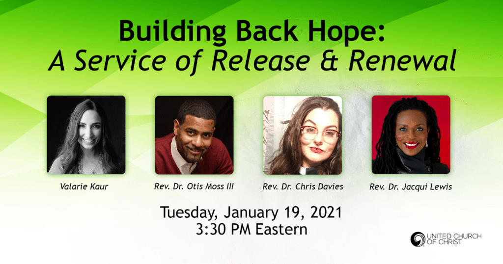 Please join the United Church of Christ and The People’s Inauguration as we curate space for Release & Renewal at the intersection of Pain & Promise. At the close of Martin Luther King Day Celebrations and on the cusp of the 47th Inauguration, we will worship together bearing witness to this past year and pouring Hope into the future. What is Hope? Hope is the confident expectation that all God intends will come to pass. Valarie Kaur, author of See No Stranger; Rev. Dr. Jacqui Lewis, Senior Pastor of Middle Collegiate Church; Rev. Dr. Chris Davies, Director of Faith Formation, UCC will join the Officers and staff as we Build Back Hope, followed with a sermon by Rev. Dr. Otis Moss III, Senior Pastor of Trinity UCC-Chicago. *closed captioning and Spanish translation will be available. We have before us the glorious opportunity to inject a new dimension of Love into the veins of our civilization. ~ Rev. Dr. Martin Luther King, Jr.