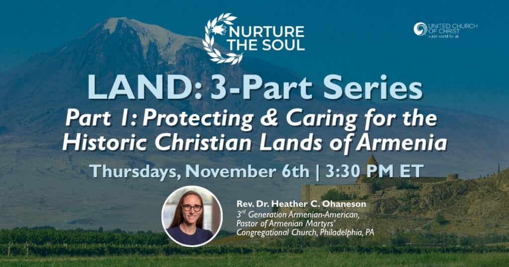 A handful of churches within the United Church of Christ identify as ethnically Armenian congregations. Come hear from one Armenian UCC pastor about the Christian treasures of the lands of Armenia, from ancient Mount Ararat to medieval monasteries to contemporary churches serving refugees from the 2020 war with Azerbaijan. After losing the territory of Artsakh (Nagorno Karabakh) in that war, Armenia is crying out for justice and for partners in protecting its territorial sovereignty. In this webinar, you will also learn about the hope-giving ways that the non-profit organization the Armenia Tree Project is looking to the future by making environmental investments in the land.