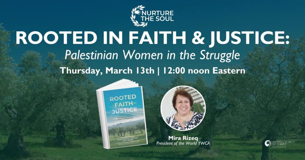 Women have played a critical role in the struggle for Palestinian rights and liberation, and have also been victims of the realities of occupation, displacement, and violence over the decades. Mira Rizeq continues to be a leader in Palestinian civil society and is uniquely able to share about the place of women in this struggle. Join this special webinar as Mira, President of the World YWCA and immediate past General Secretary of the YWCA of Palestine, speaks with Rev. Shari Prestemon, Acting Associate General Minister of the United Church of Christ and Co-Executive of Global Ministries of the Christian Church (Disciples of Christ) and United Church of Christ. They will discuss Mira’s chapter in Global Ministries’ new book, Rooted in Faith with Justice, and more.