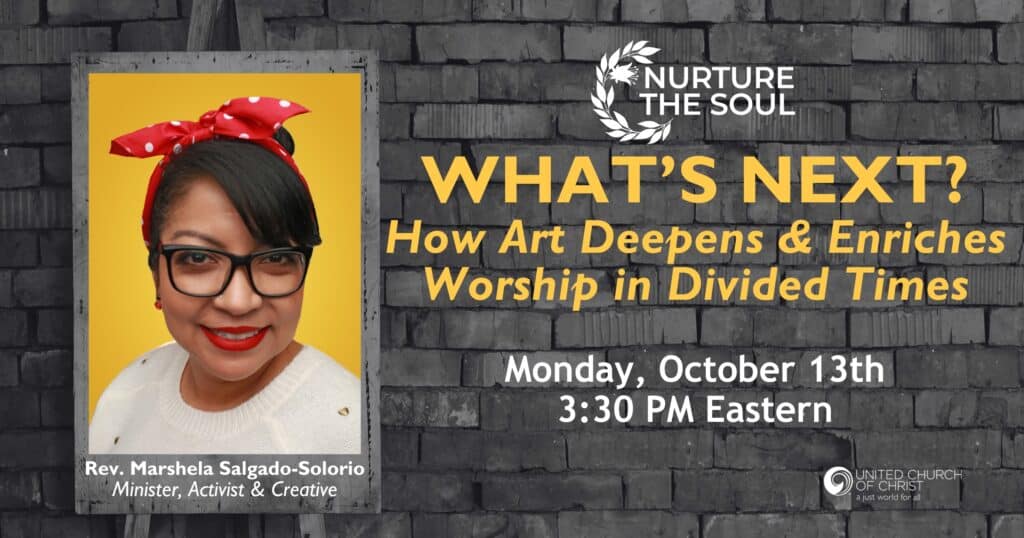 Join us for another edition of our What’s Next Series, a series curated to help us ask what we can do in divided times. We’ll be joined by Rev. Marshela Salgado for an engaging online conversation exploring how art can deepen and enrich worship. Rev. Salgado will share about the work that her congregation has done to promote various forms of art in worship, from art shows to various worship series: Theology of Broadway, [Pop]Culture Theology, Banned Books and more. Together, they’ll discuss practical ways to weave visual, musical, and creative expressions into the worship experience that inspire connection, reflection, justice, and community. This workshop will offer both theological insights and hands-on ideas for integrating art in ways that speak to the heart and spirit of your congregation.