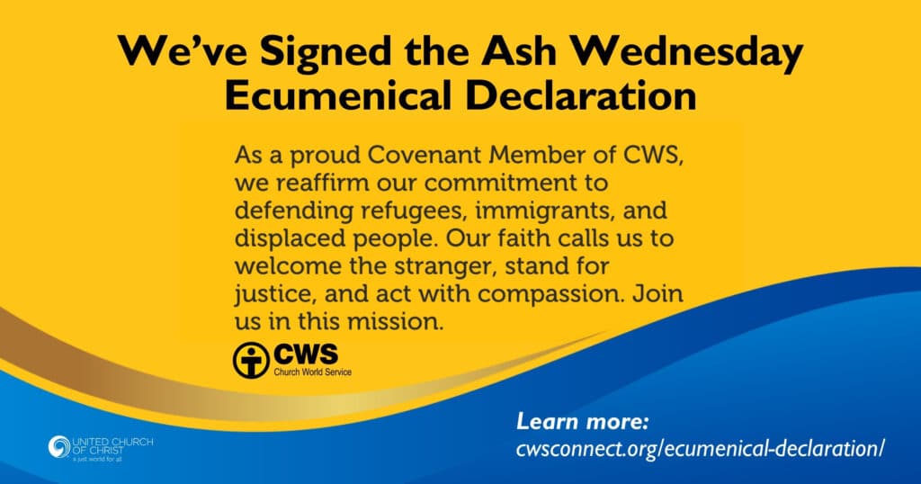 The United Church of Christ, along with four-dozen other faith-based organizations joined with Church World Service (CWS) to sign on to its Ash Wednesday Ecumenical Declaration, a public statement against policies and actions that threaten refugee rights, separate families, and undermine the long-standing tradition of humanitarian support.