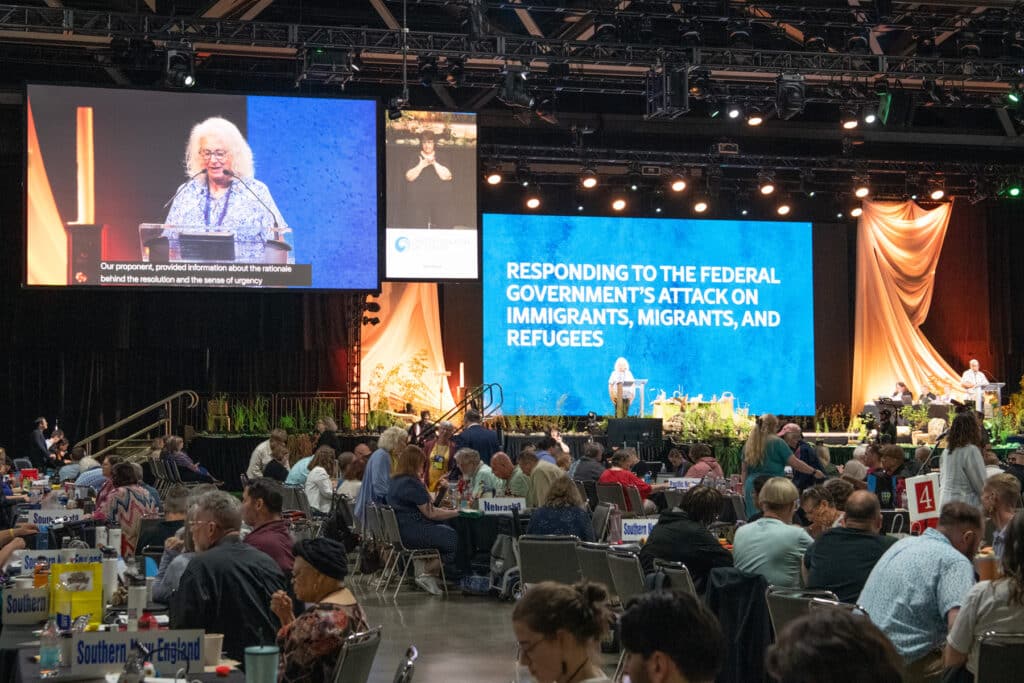 At the 35th General Synod, delegates responded in favor voting to approve (627 in favor, 8 against, and 1 abstaining) the emergency resolution from the Southwest Conference, calling to reaffirm UCC’s commitment to immigrant, migrant, and refugee rights. The resolution comes amid rising anti-immigrant policies, including expanded detentions and the rollback of protections.