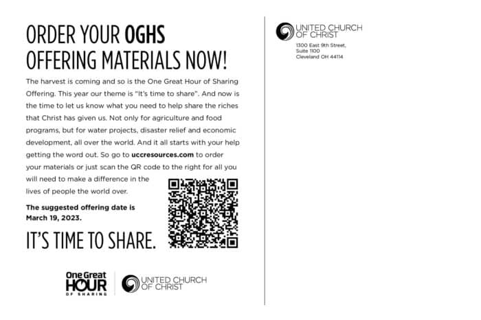 One Great Hour of Sharing (OGHS) is a Special Mission Offering of the United Church of Christ that supports partners worldwide with ministries that fund health, education and agricultural development, emergency relief, refugee ministries, and both international and domestic disaster response.