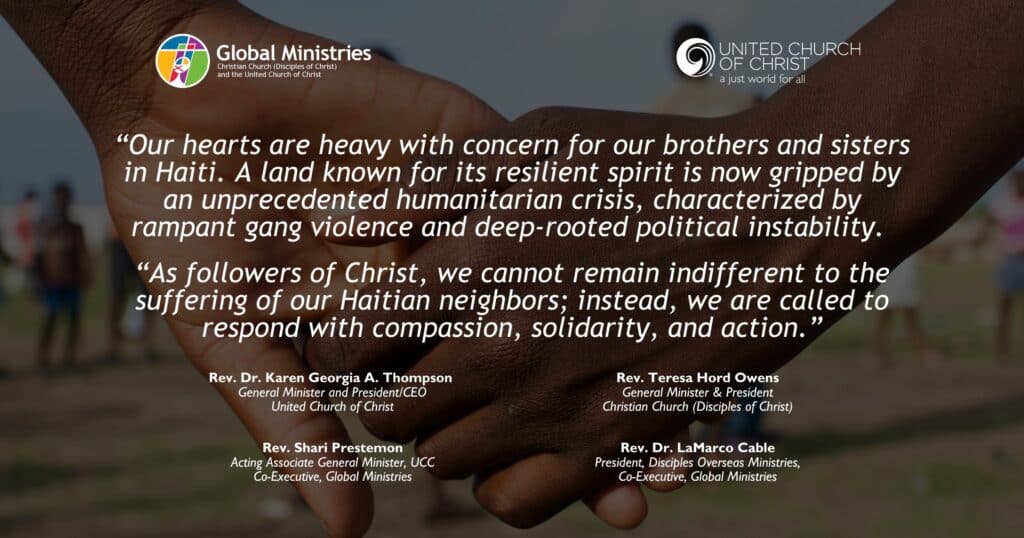 The United Church of Christ and Christian Church (Disciples of Christ) have issued a joint statement on the current crisis in Haiti as the Global Ministries. Global Ministries is a joint witness in mission between the United Church of Christ and the Christian Church (Disciples of Christ).