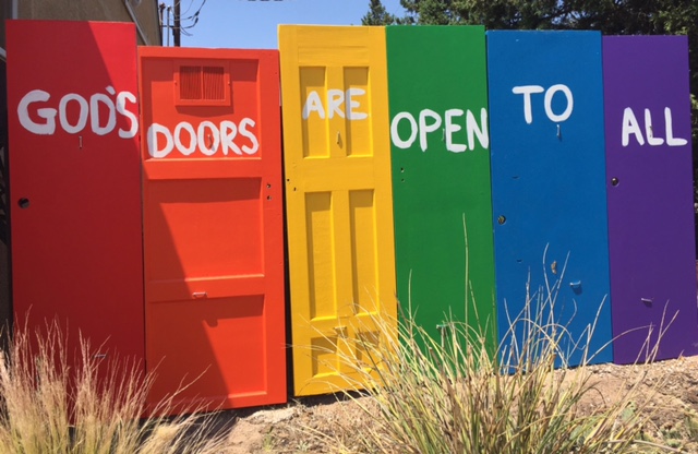 God’s doors. Six of them. Bold and beautiful — with bright colors and a vivid proclamation “GOD’s DOORS OPEN TO ALL.”