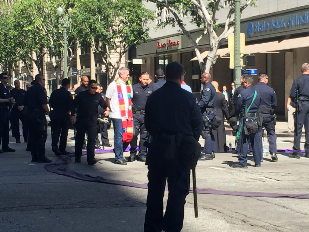 United Church of Christ immigration advocates in California, joined by dozens of other people of faith, clergy, and communitymembers in a Holy Week protest, were ready to be taken to jail Wednesday morning, March 23, in downtown Los Angeles for standing up for the rights of refugees.