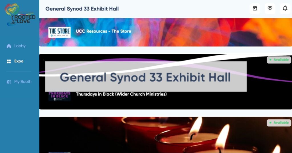 Visitors can access the exhibit hall through meet.ucc by clicking Exhibit Hall in the menu bar, and entering the same email address they used for their Synod registration. When they enter, they can go into the “Expo” and either scroll down to see each vendor or use a search window to find a particular booth. The exhibits are open 24 hours a day through Friday, July 18, and staffed for live chats between 11 a.m. and 6 p.m. EDT each day.