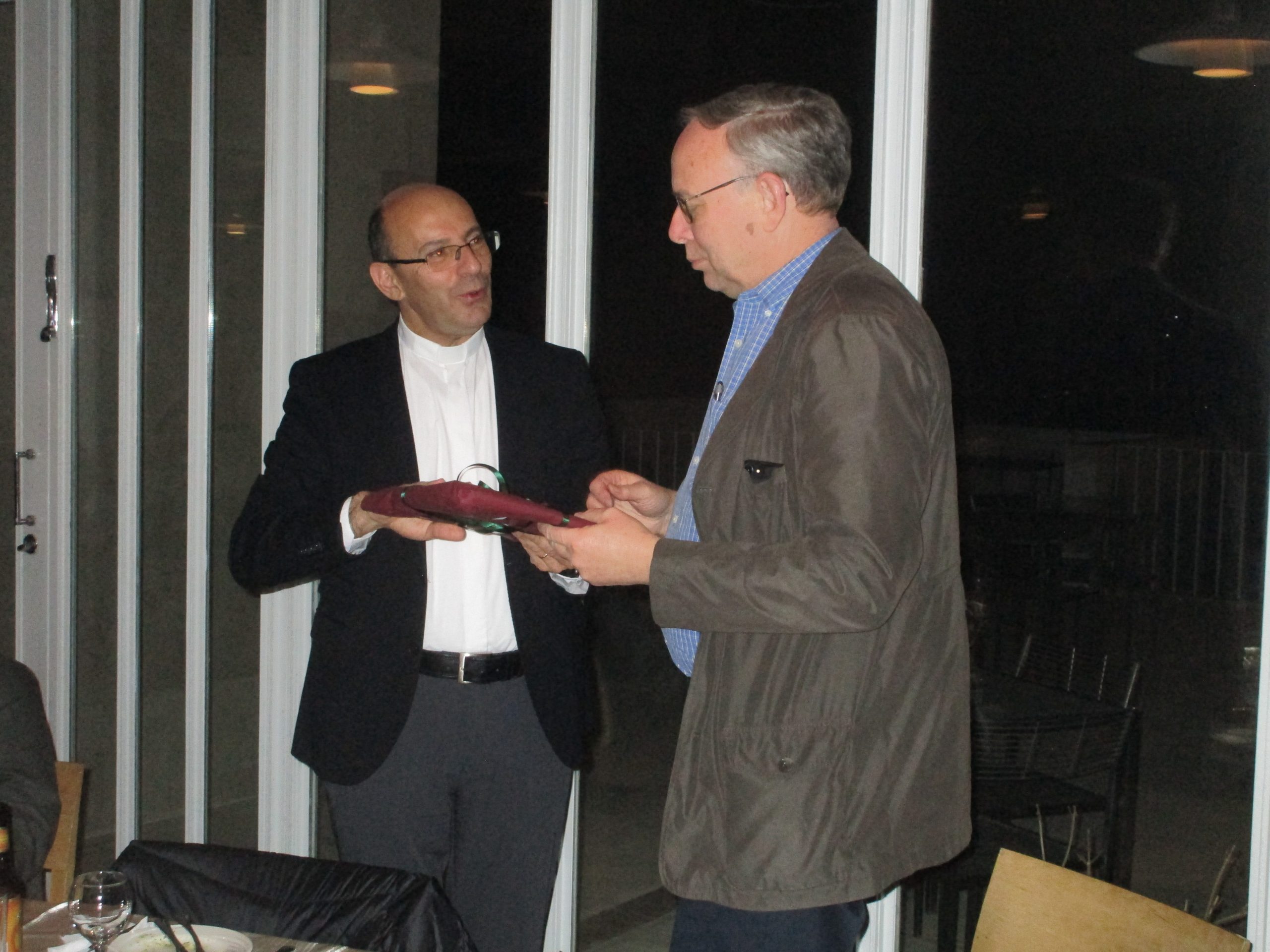 In their last meeting, Mira Rizeq, national general secretary of the YWCA of Palestine, thanked Jim for standing for peace, and for always remembering Palestine. She presented Jim with a gift, which included Palestinian embroidery, and which had written on it a phrase that she said embodied Jim’s ministry: “In everything I did, I showed you that by this kind of hard work we must help the weak, remembering the words of the Lord himself, that it is more blessed to give than to receive.”