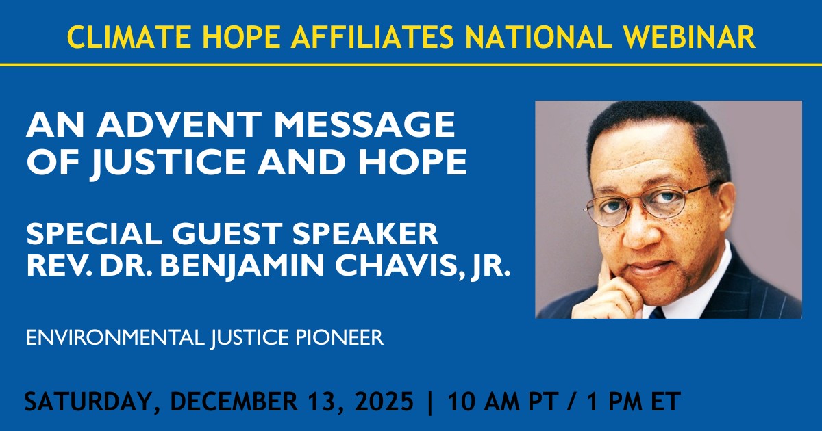 Get a sense of what Climate Hope Affiliates is all about while hearing from the Rev. Benjamin Chavis, Jr., who is often credited with coining the phrase “environmental racism.” Join Climate Hope Affiliates for its monthly national webinar on Saturday, December 13th at 1 pm ET/12 pm CT/11 am MT/10 am PT. Chavis will deliver an Advent message of justice and hope. Sign-up to join us!