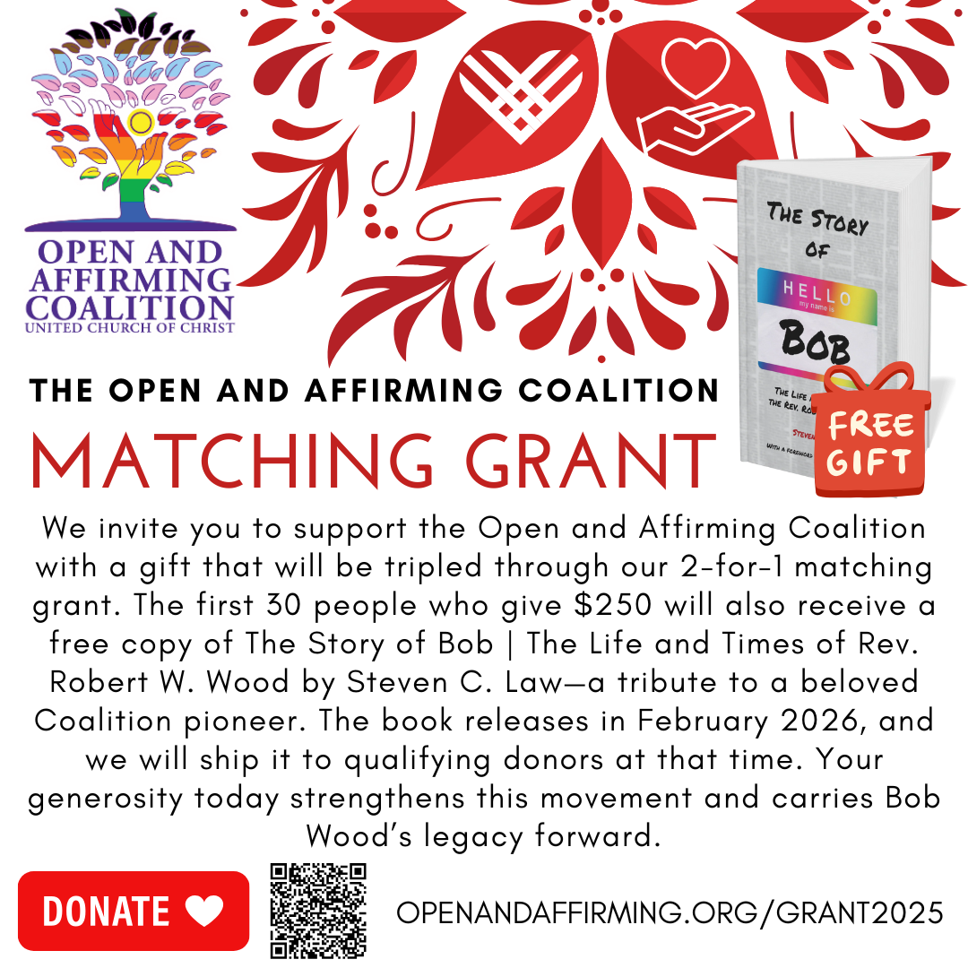 Your gift to the Open and Affirming Coalition is tripled through our 2-for-1 matching grant, strengthening a national movement of LGBTQ+ faith, affirmation, and justice. The first 30 donors who give $250 will also receive The Story of Bob—a tribute to Rev. Robert W. Wood, an early pioneer who helped shape today’s LGBTQ+ faith movement. Your generosity fuels ministries of courage, compassion, and liberation. Learn more here!