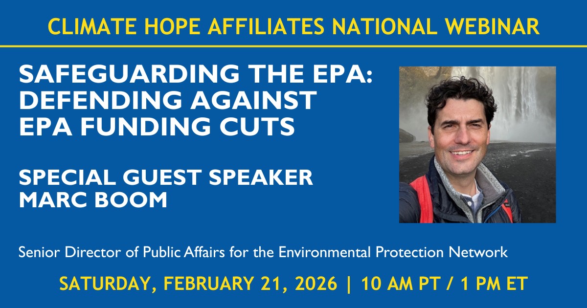 Get a sense of what Climate Hope Affiliates is all about while hearing from a leading expert on current battles over EPA funding. Marc Boom will unpack for us what happened with Fiscal Year 2026 funding before turning our attention to present struggle over Fiscal Year 2027. Climate Hope Affiliates will have its monthly national webinar on Saturday, February 21st at 1 pm ET/12 pm CT/11 am MT/10 am PT. Sign-up to join us!