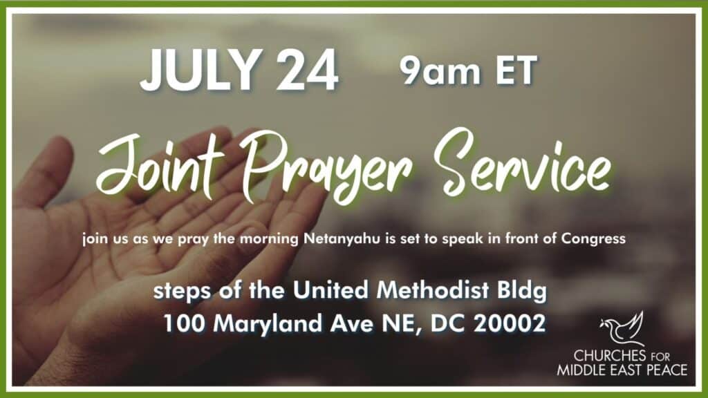 Join Churches for Middle East Peace and several of our member denominations on July 24th to pray for an end to violence and military action in Gaza ahead of Israeli PM Benjamin Netanyahu’s address to Congress. We will hear from an ecumenical group of Christian leaders prayerfully calling for (1) a permanent ceasefire, (2) demilitarization, (3) the allowance of humanitarian assistance into Gaza, (4) the release of Israeli hostages and Palestinians being held without cause, and (5) for the underlying conditions of the occupation to be addressed. Learn more here.