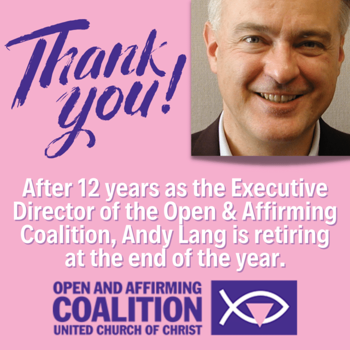“Andy came to his role at a very challenging time for the Coalition and provided strong, stable, pastoral leadership,” Schuenemeyer said. “He built and strengthened relationships. He fostered innovations to not only encourage and support local churches just entering the Open and Affirming process, but also offering resources and strategies for existing congregations to live faithfully into their ONA covenants.”