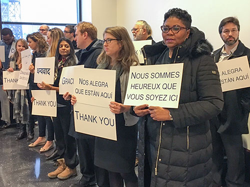DeBraber, joined by colleague the Rev. Traci Blackmon, was one of a few dozen people who came out to acknowledge the new Americans with signs that said ‘welcome’ and ‘thank you’ in their native languages. Ethopia, Cameroon, Iraq, France, Canada, Colombia and Greece among the twenty countries represented in the ceremony today.