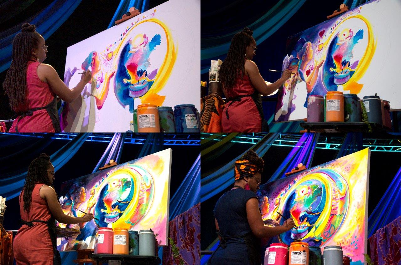 Three artists are using painting, poetry and music to create theological reflections throughout the United Church of Christ’s General Synod in Milwaukee June 21-25. The first took a specially designated artist’s stage Friday and filled an entire canvas by Saturday morning while observing the opening worship service and two business sessions. She saw themes of love and liberation.
