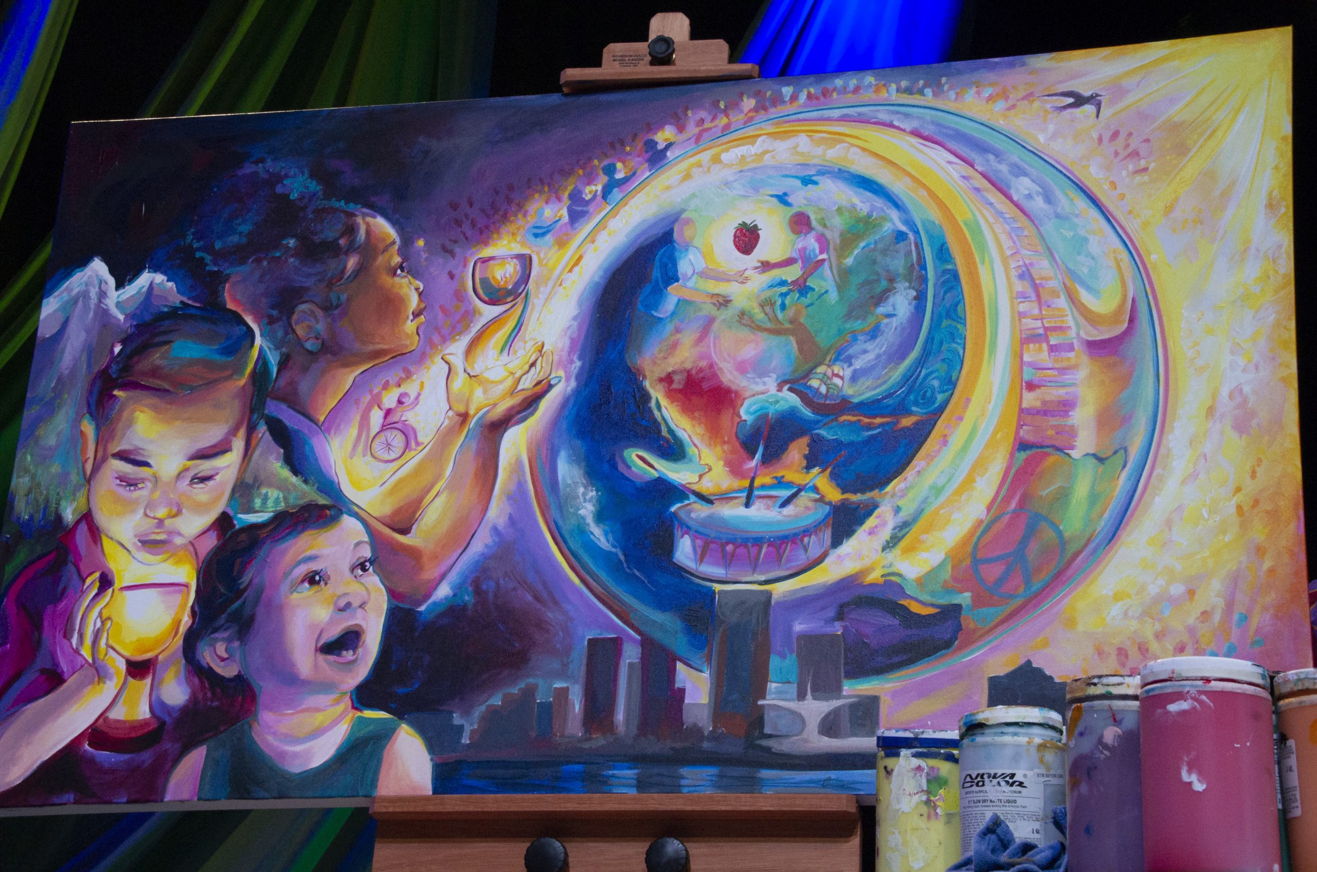As Friday and Saturday progressed, the canvas had transformed in a way that Richardson called typical of her work, changing from what she thought it would be to what it became. The finished image features three children, one holding a flame that shines on a symbolic world that encompasses many themes she observed, all hovering over a Milwaukee skyline. She said the light on the world changed as she painted, journeying to its opposite side on the canvas, a transformation that surprised her.