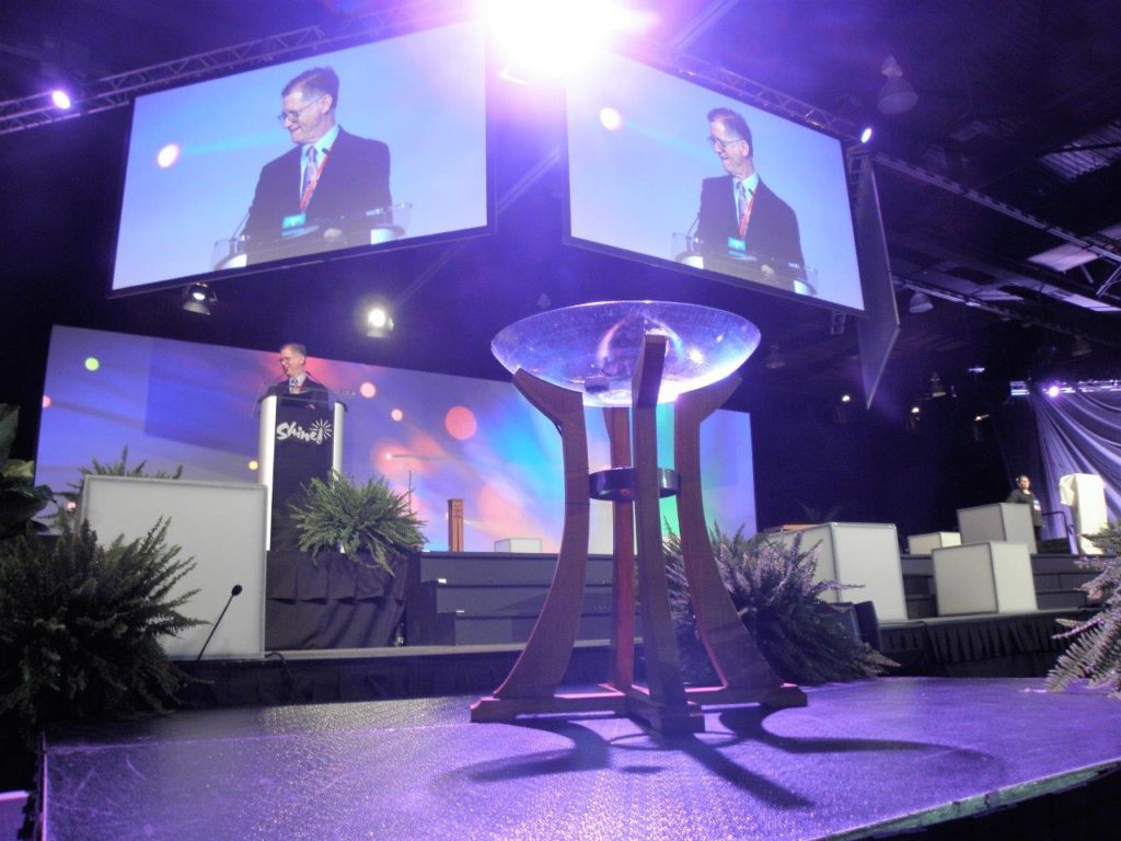 Years ago, the Rev. Alexandra Childs saw rainbows of light coming through the crystal edges of the cross in Cleveland’s Amistad Chapel. She wanted to borrow that cross and that light for the General Synod stage environment she was designing. Mounted atop a long metal rod, the cross was, unfortunately, too heavy for a procession and could have been damaged in transit.