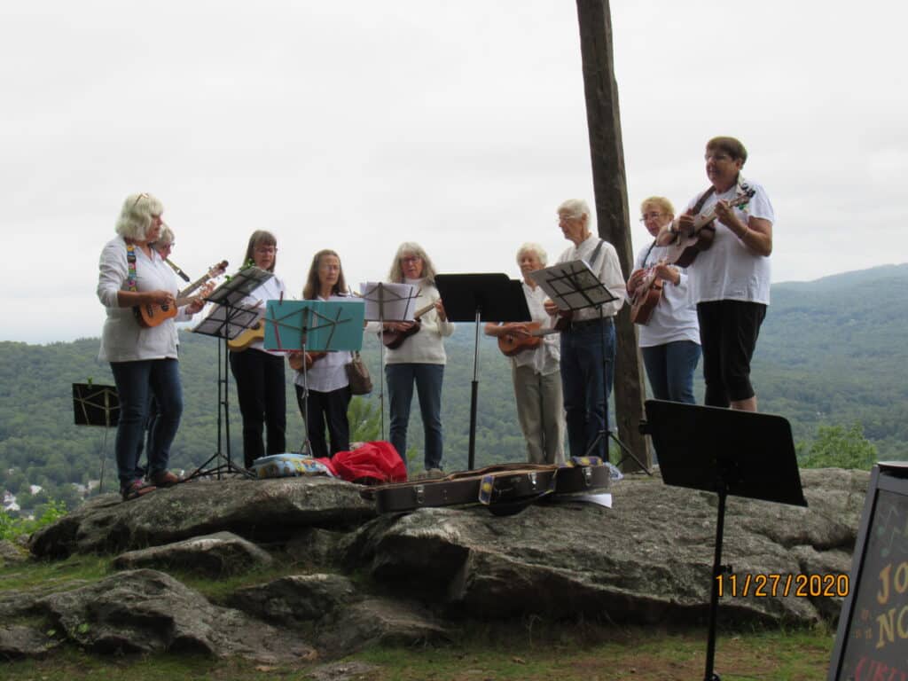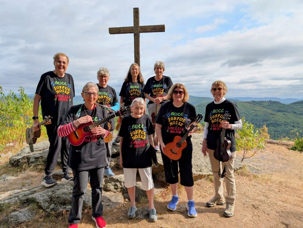 All the way across the country in New Hampshire, Debbie Doe, leader of the Bristol, NH UCC ukelele band, agrees about the importance of being part of the fabric of the local area. Their group was founded with that in mind.