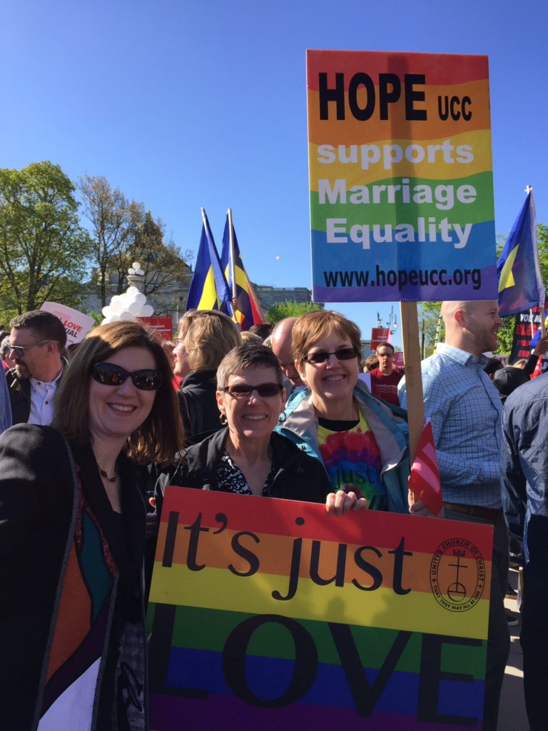 The Rev. Mike Schuenemeyer, UCC executive for health and wholeness advocacy, was also in Washington, D.C. He was one of about 75 people from the faith community who on Tuesday morning marched from the Lutheran Church of the Reformation to the steps of the Supreme Court building, where he said the crowd was “overwhelming supportive” of same-sex marriage. He also noted a strong turnout from pastors and lay members of the UCC.