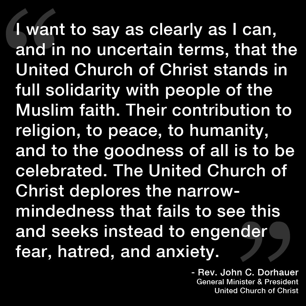 Dorhauer, who on Thursday spoke out against planned anti-Islam protests, called on UCC congregations to stand in solidarity with people of the Muslim faith. His words, picked up by news publications and shared in social media, reached nearly 90,000 people on the UCC’s Justice and Witness Facebook page –– a record number. The same graphic on a different page received more than 1,800 likes and 1,600 shares.