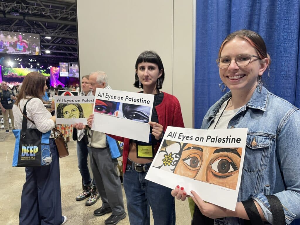 On the first day of General Synod, a group gathered outside the Kansas City Convention Center for a candlelight vigil. Participants held signs with artful depictions of eyes while singing and praying together. “All eyes on Palestine,” the signs read, and “We cannot look away.”