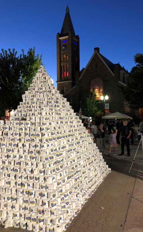 “It takes a village to raise a pyramid,” said the Rev. Dwight Lee Wolter, pastor of the Congregational Church. “Over 1,500 people—workers and donors—contributed to this effort to provide toilet paper to homeless veteran and domestic violence shelters. Over 15,000 rolls were ultimately collected for this communal effort without corporate or foundation support. And we noticed, by the way, the moon atop the pyramid that appeared like a celestial benediction.”