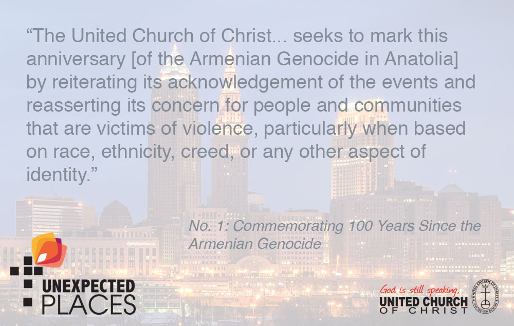 Armenian-Genocide.jpgThe United Church of Christ General Synod will have an opportunity to collectively and publicly lament the 100th anniversary of the Armenian Genocide with the consideration of a proposed resolution before the church’s governing body later this month. Just as important, this resolution will give the denomination a chance to condemn any violence based on race, ethnicity or religion—the type of violence happening in Syria, for example, where many Armenian refugees fled.