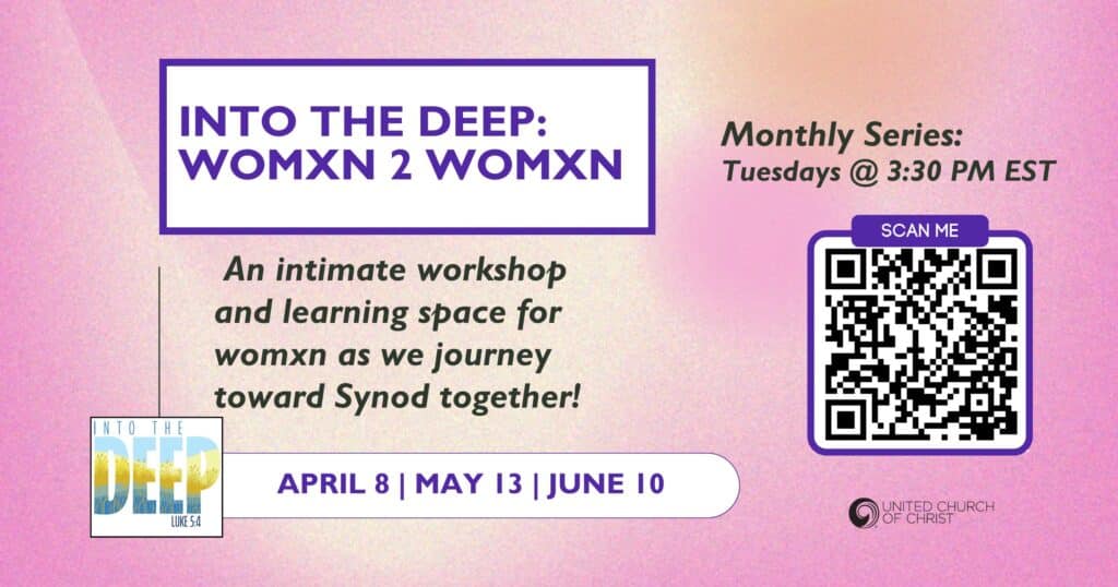 The Into the Deep: Womxn 2 Womxn series aims to be an intentional space to embrace the wide spectrum of womanhood that exists throughout the denomination, Ward says. The series will span the course of the next three months (April 8, May 13, and June 10), and will feature guest speakers and presenters speaking about their shared experiences, as well as offering resources that attendees can use. The series will culminate at General Synod in July, where an in-person networking event is being planned to continue fostering community.