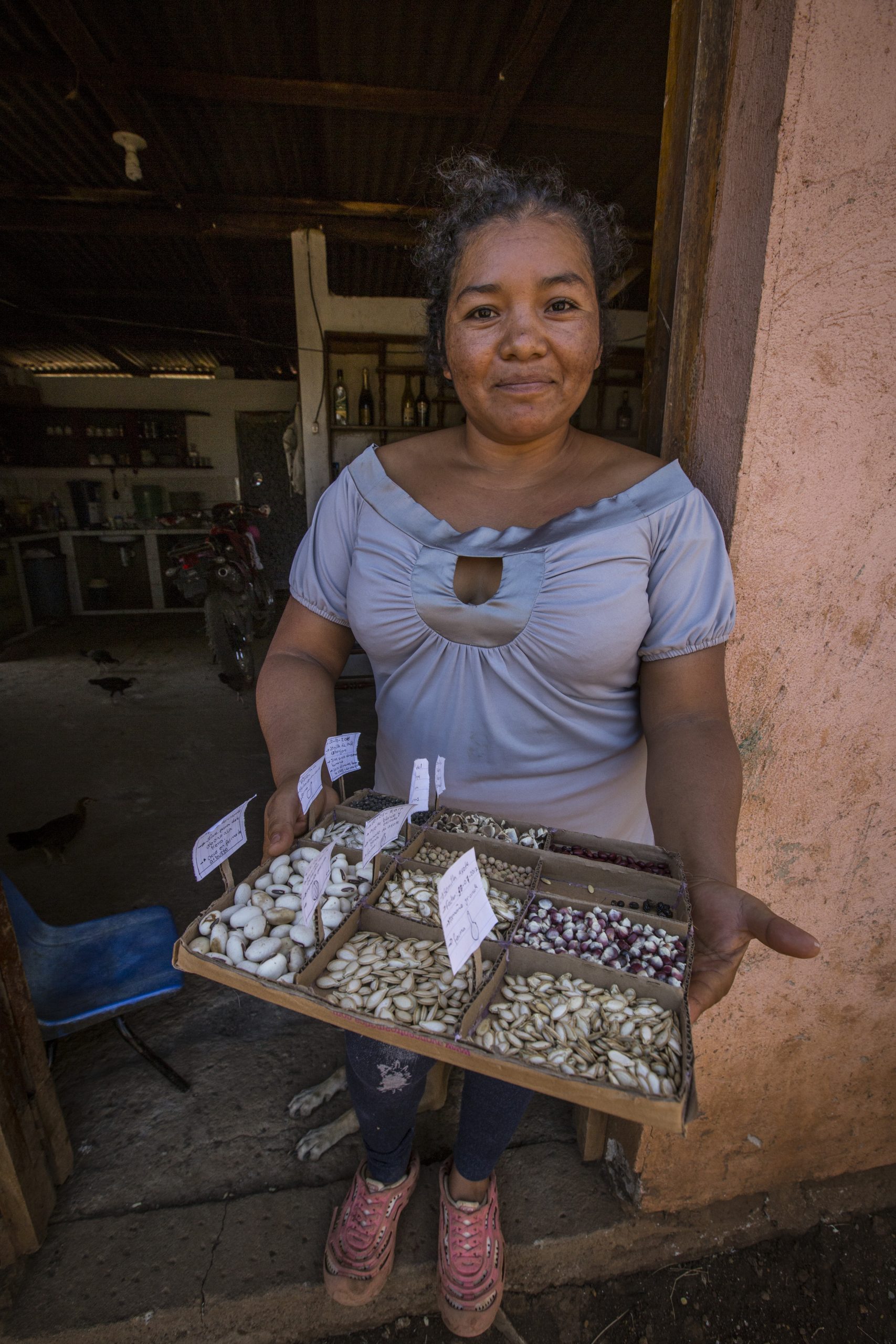 Her first focus is seeds. Training in seed selection enables her to plant quality seeds, which she preserves and catalogues for next season and is sharing with her neighbors.
